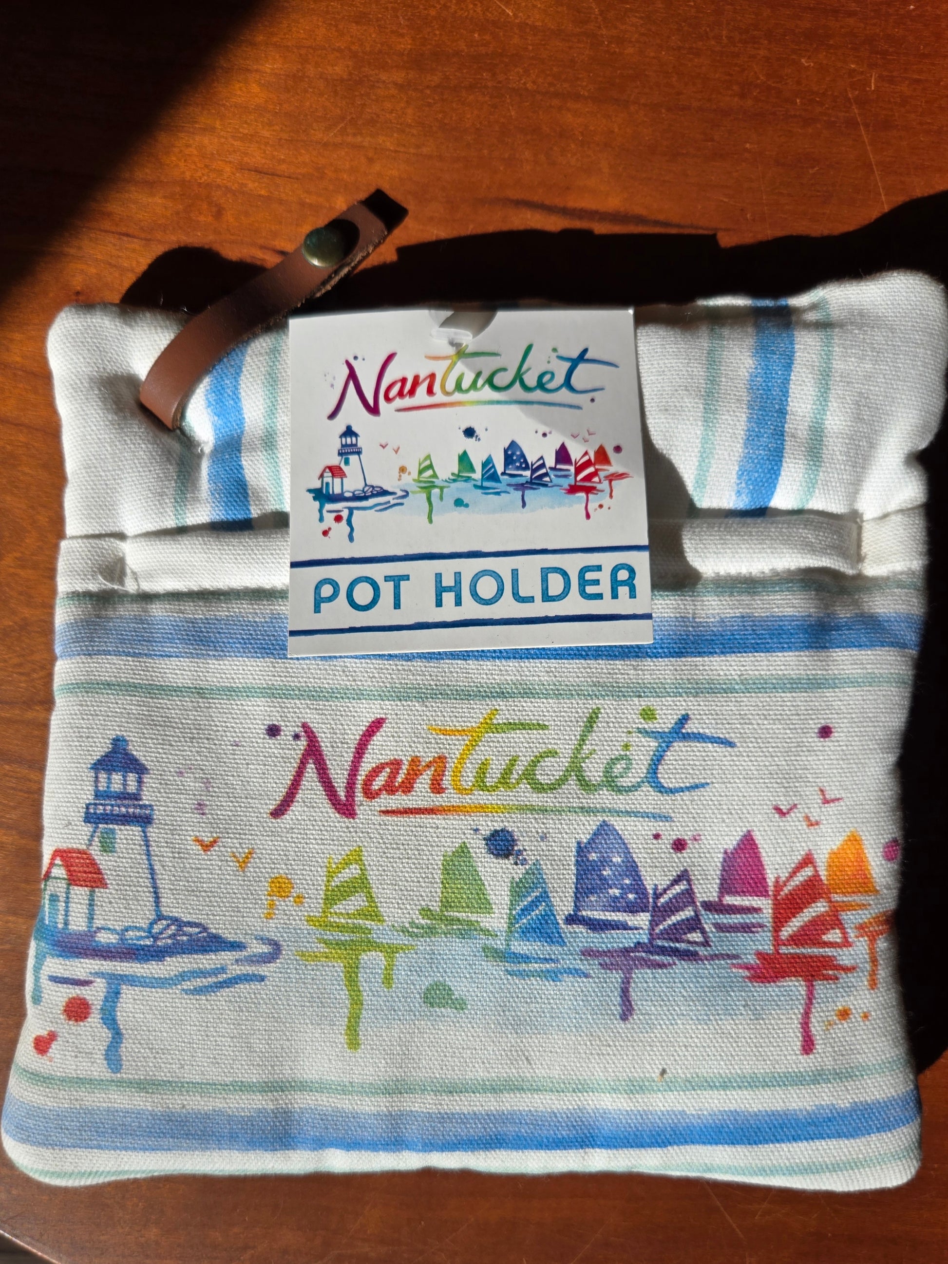 Designed in the US and made in India, this is an 8" x 8" cotton potholder with a front pocket, a leather hoop for hanging and decorated with a watercolor design featuring the iconic Rainbow Fleet of Nantucket