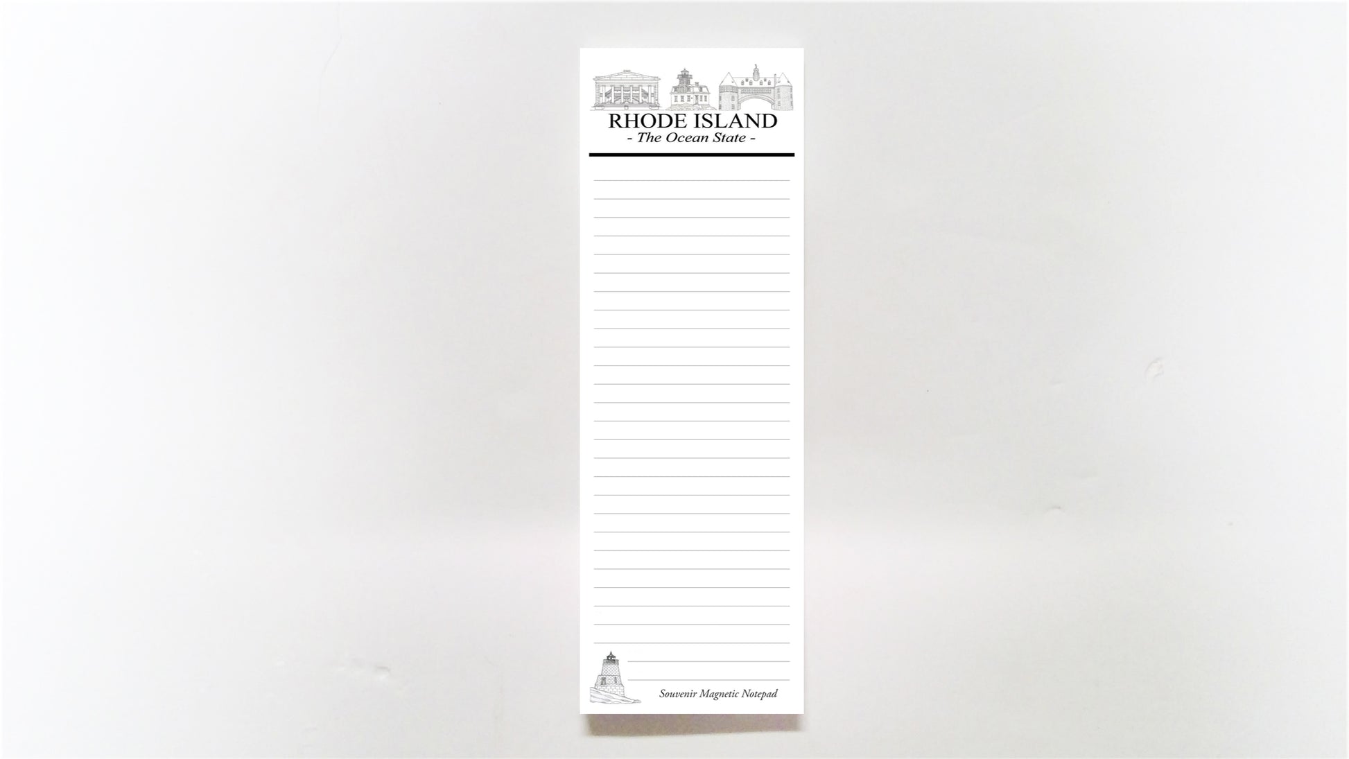 Our Rhode Island magnetic notepad offers 50 sheets of paper with each sheet decorated with the Arcade Providence, the Narragansett Towers and Rose Island Lighthouse